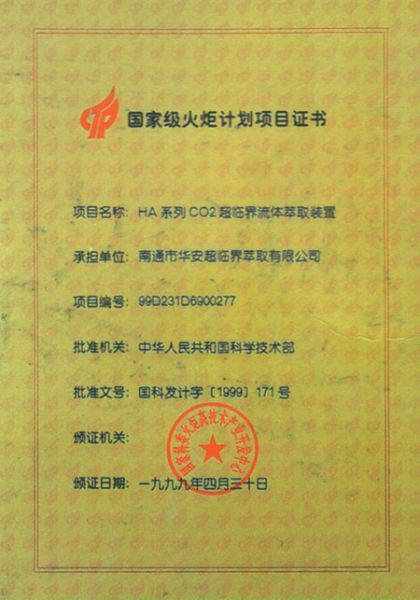 国家级火炬计划项目证书